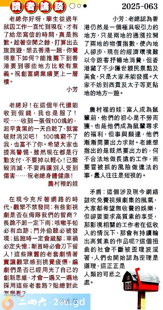 第零六三期讀者論談 1.老總你好呀,學生從過年就因工作一直忙到現在,才有了給您寫信的時間,真是抱歉。趁著空閒之餘,打算出去旅旅遊,想去香港一趟,你覺得意下如何?能推薦下到香港要到哪些地方比較有意義。祝創富網業績更上一層樓。小芳 〖小芳〗:老總認為香港仍然是一個極具吸引力的地方,只是兩地的通漲拉開了兩地的物價指數,使內地人卻步,現在的經濟環境難以令遊客抒暢地消费,但香港藏了不少隱世親民景點及美食,只是大家未能發掘大家不妨到西貢及太子等更貼地的地方一遊。 2.老總好!在這個年代還能收到假錢,我也是服了!哎......收到一張假100塊的,起早貪黑的一天白乾了,就當破財消災吧!100塊窮不了我,也富不了你。希望大家也提高警惕,雖然現在都是行動支付,不要掉以輕心!已撕毁消滅,不要再讓別人受到傷......祝老總身體健康!農村裡的娃 〖農村裡的娃〗:當人成為鼠輩前,他們的初心是不勞而獲,也是他們成為鼠輩尋求的福利,但事與願違,他們漸漸需要出力求財。老總想指出的是既然要出力的,何不合法地做長遠的工作,而要冒被抓的風險做違法的事,蠢人往往是短視的。 3.在現今充斥著網路的時代觀眾不禁發問:有些影視劇是否在侮辱我們的智商?長跪不起一定下雨;咳嗽手帕必有血跡;門外偷聽必被發現;逃跑時一定會崴腳;車禍必定失憶;斬首時必會刀下留人!這些陳舊的老套劇情著實讓觀眾感到視覺疲憊,编劇們是否已經用光了自己的創新思維,才會一遍又一遍地採用這些老套路?貼總對此怎麼看?矛盾敬 〖矛盾〗:這個涉及現今網絡鼓吹免费視頻劇集的風氣,大家都希望無收費的娛樂,但卻要要求高質素的享受,那影視相關的工作者在低收入的情況下,那會有持續輸出高質素的作品呢?這個扭曲的社會不斷被歪理波淫著,人們也開始認為歪理是道理,這正正是人類的可悲之處。
