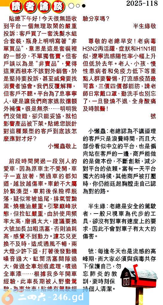 第一一八期讀者論談 1.貼總下午好!今天很無語收到平台一個無理取鬧的嚴重投訴:客戶買了一套洗髪水組合套裝,瓶身上明明寫著“非單買品”,意思是這是套裝裡的一部分,不單獨售賣。但客戶誤以為是“非賣品”,覺得這東西根本不該對外銷售,於是堅持要投訴,甚至威脅要找消费者協會。我們反覆解釋,但客戶不聽。平台為了息事寧人硬是讓我們商家退款還額外補償。很......明我們沒做錯,卻只能妥協,就怕影響產品被下架。貼總您說針對這種類型的客戶到底該怎麼應對才好?小懶蟲敬上 〖小懶蟲〗:老總認為不講道理的客戶只是浪費時間,而且大部份看似中立的平台,也是偏向站在客戶的一邊,商戶能做的是做本份,不斷創新,減少對平台的依賴。當有一天平台獨大的時候,其他商戶被打壓時,你仍能廷起胸膛走自己認為對的路。 2.前段時間開過一段別人的愛車,因為原車主不愛開,車子一直放著,開過車的都知道,越放越傷車。車齡不大屬於紧湊型,車前後保險捍脱落,疑似常被追尾,排氣管黝黑,燒機油嚴重。引擎巔峰狀態,但拉缸嚴重,由於使用頻率太高,磨損太大,建議要換大號加長加粗活塞,否則油耗高,感覺不到動力。濾芯兒更換不及時,造成通風不暢,兩大燈少許下垂,打著後發動機噪音過大,缸筒活塞間隙過大,做過全車划痕處理,噴過全車......根據我多年開車經驗,此車長期被人野蠻駕駛,為事故車!貼總有駕駛經驗分享嗎?半生緣敬 〖半生緣〗:老總是安全的駕駛者,一般只視車為代步的工具,卻沒有對車有速度上的要求,因此不會對車子有太大的傷害。 3.尊敬的老總早安!老病毒32再活躍,症狀和11相似,遼寧流感陽性率小幅上升但低於去年。老人、小孩、慢性患病者和免疫力低下等重點人群要警惕,打流感疫苗最可靠,三價四價都能防,請老師日常戴口罩、勤洗手也别忘了,一旦發燒不退、全身酸痛及時就醫!號 〖號〗:每逢冬天也是流感的高峰期,而大家必須與病毒共存下保護自己,勿忘肺炎的教訓,要時刻保持個人清潔。