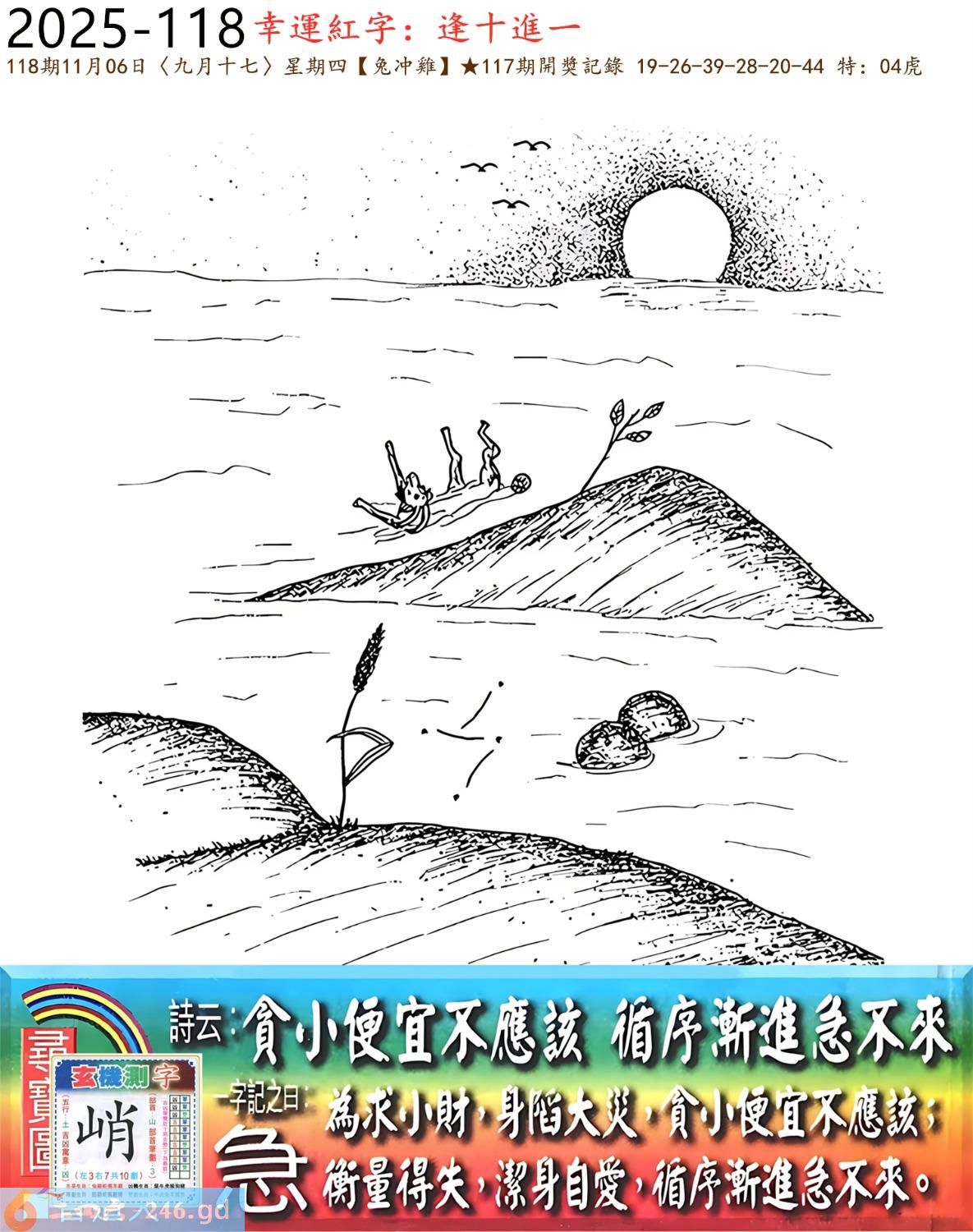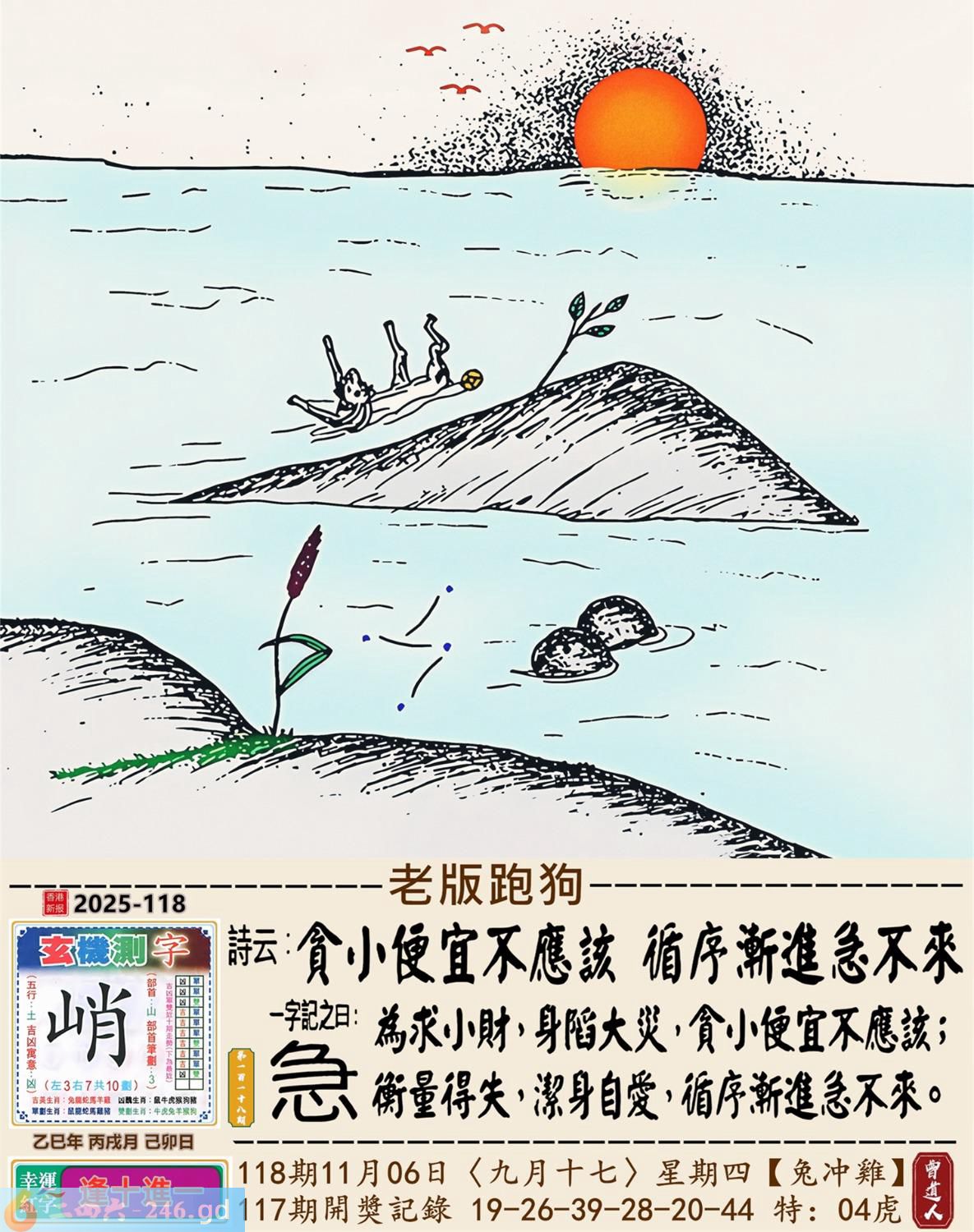 2025年11月6日118期鸡(癸酉)(城墙土) 118期:老版跑狗玄機一字記之曰:【急】 诗云:貪小便宜不應該循序漸進急不來 為求小財,身陷大災,貪小便宜不應該; 衡量得失,潔身自愛,循序漸進急不來。 玄机测字:《峭》 密圖詩:一臉蒙逼買三四 《記》:八面來風臘月會 特碼大小單雙句:小小買注二十塊 今期必中:馬岱 118期:特碼歇后語 饿着肚子造反-----借机(饥)闹事 118期正版四字梅花诗:一丝不挂。 118期火车头:烧伤马。诗:猪死猴伤,绿波今期有特码。 118期香港第一手欲钱料:暗淡无光。 118期曾道人说:“春暖花开?” 118期另版四字梅花诗:羊入虎口。 118期香港第一手欲钱料:欲钱看飞机。 118期曾道人说:“为什么英雄爱美人呢”? 118期:二字經:七碼 118期:轮船是特码 118期:智力金壤:无为而治 118期:信箱紅字:【梧桐斷角】 118期:【暗碼:24-31-36-38】 118期:一語中特:【三五成群】 發財玄機圖:神通廣大雷電交加圖中明龍紅綠 118期:藏寳圖 新:苏小门前万缕垂 老:伴人东去到江城 禁:羊禁:5尾玄機字《存》 2025年118期【生活幽默】版 〖用中文怎么說〗 有個外國學生初學中文,十分吃力。 有一天,老師問他:“如果我想讓某人到這邊來,用中文怎麼説?” 這外國學生一字一頓地説:“這邊請。”老師聽了滿意地點了點頭:“那麽,如果我想讓某人出去,用中文又要怎麼說?" 衹見外國學生走到外面,然後對老師說:‘這邊請’。”