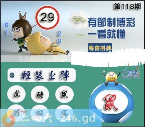 2025年118期正版彩图挂:29 爆:鼠 挂牌成语:轻装上阵 挂牌出肖:虎猪鼠鸡猴马