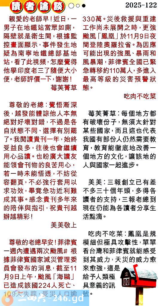 3.尊敬的老總早安!菲律寶一週內遭遇兩次颱風#根據菲律賓國家減災管理委員會發布的消息,截至11月9日上午,颱風「海鷗」已造成該國224人死亡、109人失踪,受災人口逾330萬。災後救援與重建工作尚未展開之時,更強颱風「鳳凰」於11月9日夜間登陸奥羅拉省。為因應可能出現的強風、暴雨和風暴潮,菲律寶全國已緊急轉移約110萬人,多進入最高等級的災害預警狀態。吃肉不吃菜