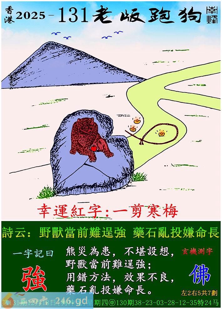 131期老版跑狗一字記之曰:【強】 詩雲:野獸當前難逞強,藥石亂投嫌命長。