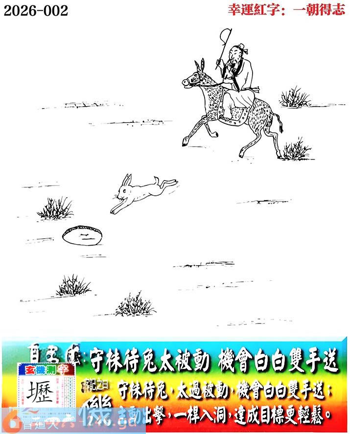 002期老版跑狗一字記之曰:【機】 詩雲:守株待兔太被動,機會白白雙手送。 守株待兔,太過被動,機會白白雙手送; 主動出擊,一桿入洞,達成目標更輕鬆。 玄機測字:《壢》