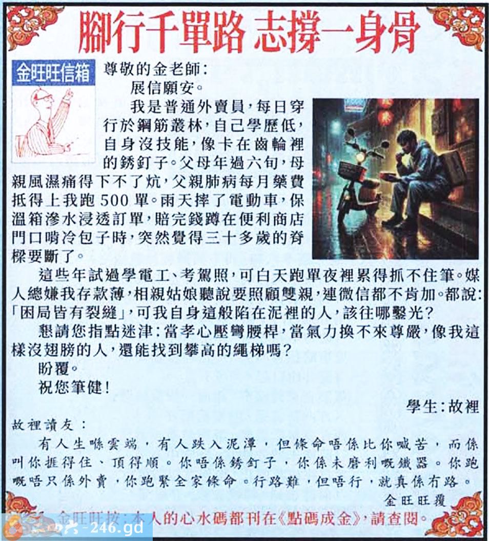 013期:金旺旺信箱彩民推荐→→《腳行千單路 志撐一身骨》