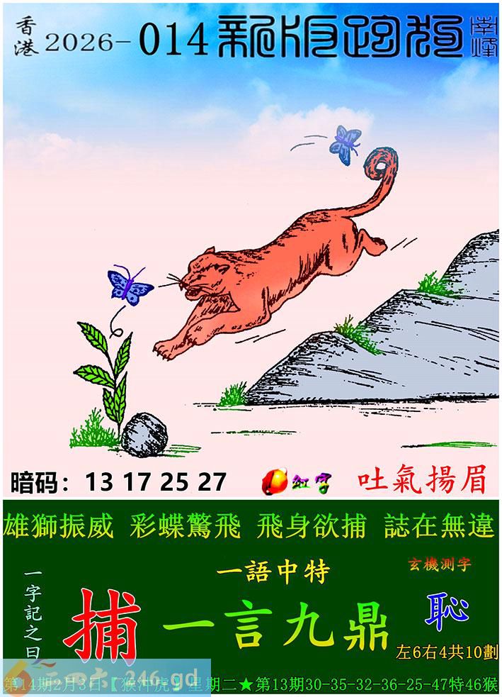 014期跑狗一字記之曰:【捕】 雄獅振威,彩蝶驚飛。 飛身欲捕,誌在無違。 玄機測字:《恥》 一語中特:一言九鼎