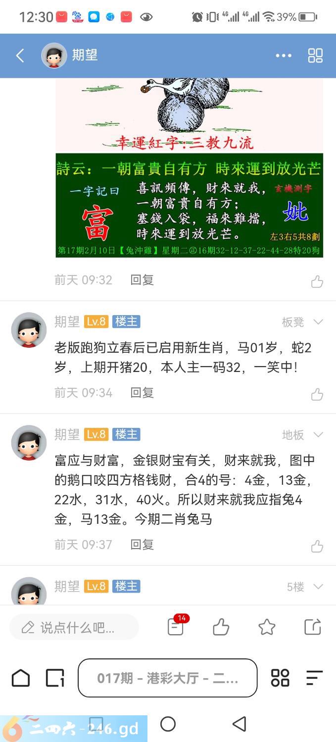 上期题外话:017期宝图开始启用新生肖,因为老句解天肖女肖仙肖吉美肖兔,开40丁卯炉中火,与新句吻合!老版跑狗鹅口咬四格铜钱,合4的金只有4兔,13马!二肖兔马。因上期宝图解料时我还用旧肖套码,所以主水13,从而失去主中一肖,可惜。