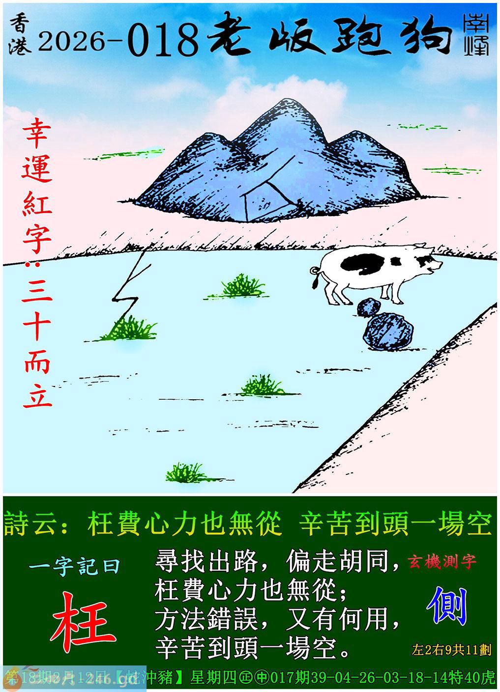 018期老版跑狗一字記之曰:【枉】 詩雲:枉費心力也無從,辛苦到頭一場空。 尋找出路,偏走胡同,枉費心力也無從; 方法錯誤,又有何用,辛苦到頭一場空。 玄機測字:《側》