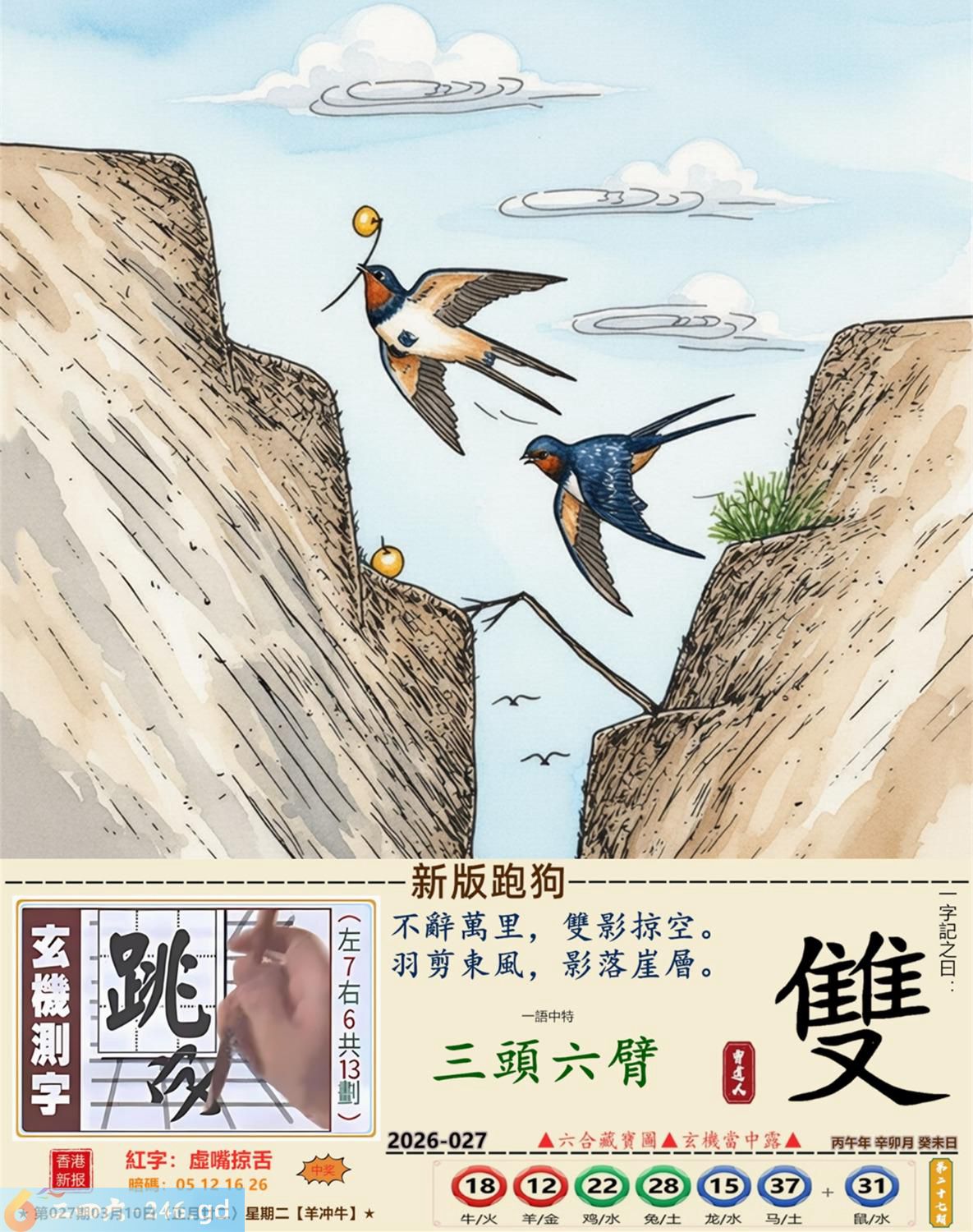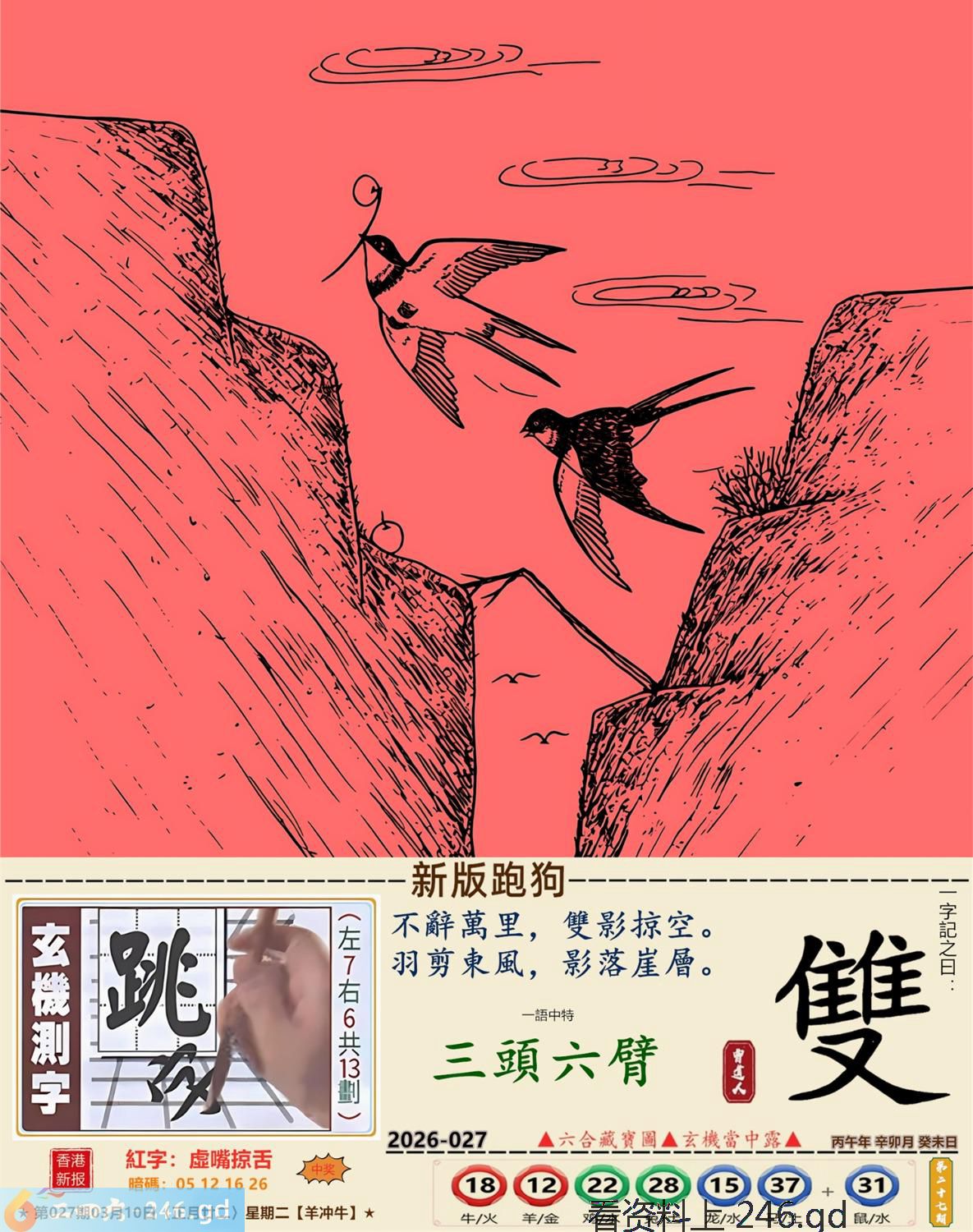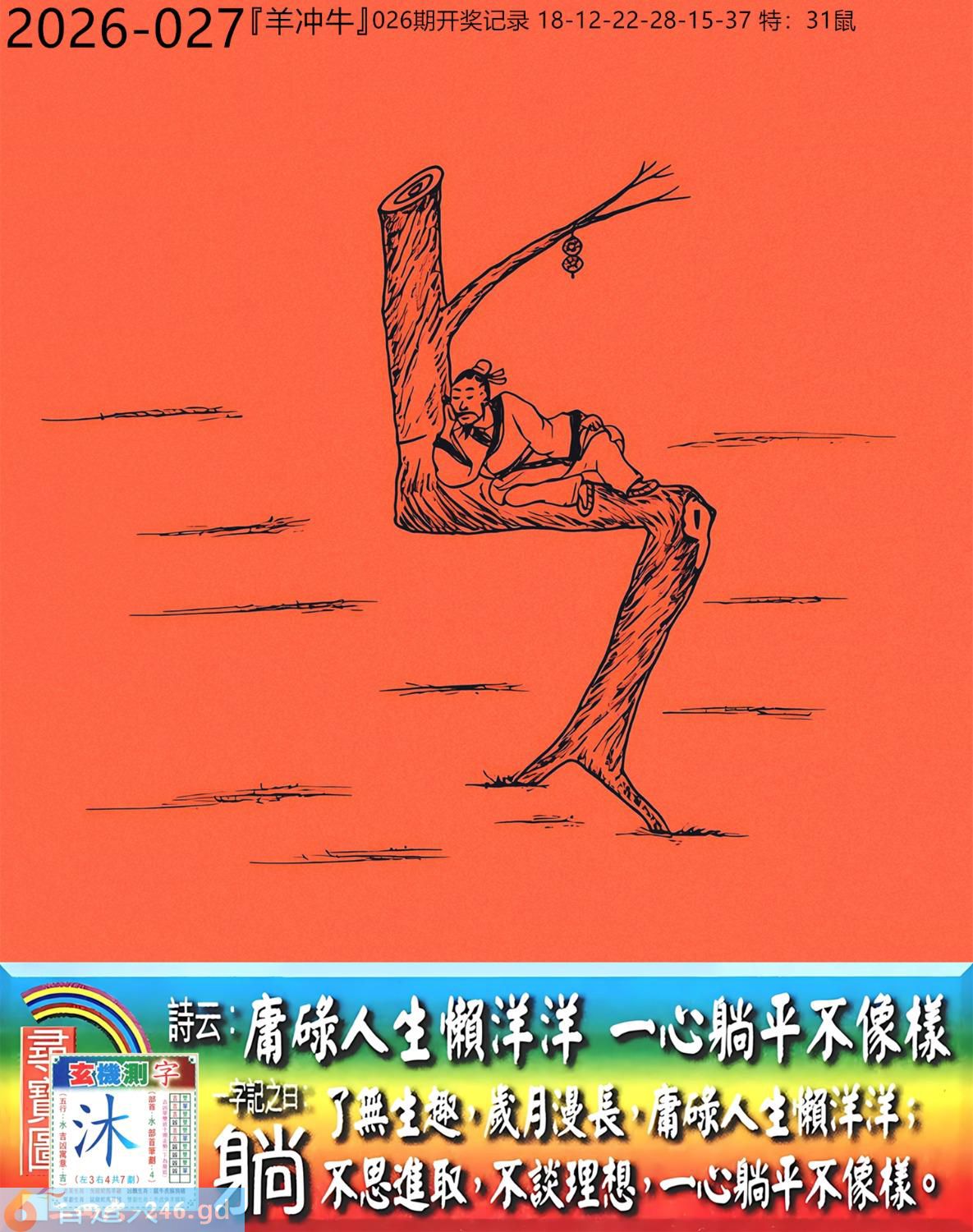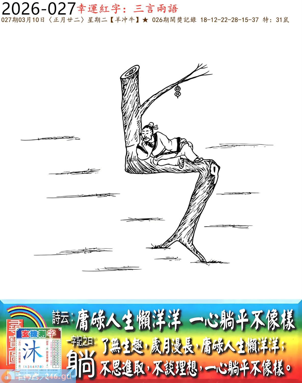 2026年3月10日星期二杨柳木羊日冲牛 027期:老版跑狗玄機一字記之曰:【躺】 詩云:庸碌人生懶洋洋,一心躺平不像樣。 了無生趣,歲月漫長,庸碌人生懶洋洋; 不思進取,不談理想,一心躺平不像樣。 玄機測字:《沐》 密圖詩:一群好漢三人幫 記:落入平川斷其尾 特碼大小單雙句:單憑九字定財局 今期必中:馬鐵 027期:特碼歇后語 洗衣不用搓板-----就凭一双手 027期正版四字梅花诗:酒醉饭饱。 027期火车头:烧伤猴。诗:牛死龙伤,今期生肖住门庭。 027期香港第一手欲钱料:子? 027期曾道人说:“天下第一”? 027期另版四字梅花诗:束手待毙。 027期香港第一手欲钱料:欲钱买站立睡眠的动物。 027期曾道人说:“找赋性愚蠢太无知” 027期二字经:提挈。 027期:曾英权是特码 027期:智力金壤:直抒己见。 027期紅字:【虛嘴掠舌】 027期暗碼:【05121626】 發財玄機圖:獨立冷靜友善親人圖中明狗藍綠 027期:藏寶圖 新:只今莫唱贞元曲 老:悄立市桥人不识 禁:蛇禁:2尾玄機字《莼》 2026年027期【生活幽默】版 〖機智善談 〗 生活幽默機智善談 陸某,機智善談。邻家有一婦人,不苟言笑。朋友對陸某説:"你若能説一字,逗此婦人發笑;再一字,令此婦人罵街,我就請你吃飯。" 陸某答應,于是二人同去找那婦人。婦人正站在門口,門外還有衹狗。 陸某急走幾步,來到狗跟前,撲通一聲跪下了:喊到:"爹!" 婦人一愣,随即笑了起来。 陸某又抬起頭,對婦人:"娘!"婦人破口大罵。