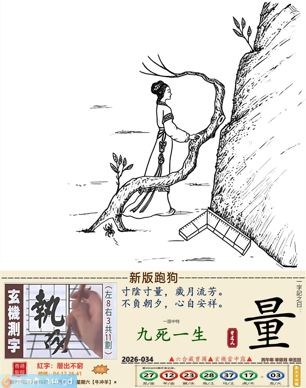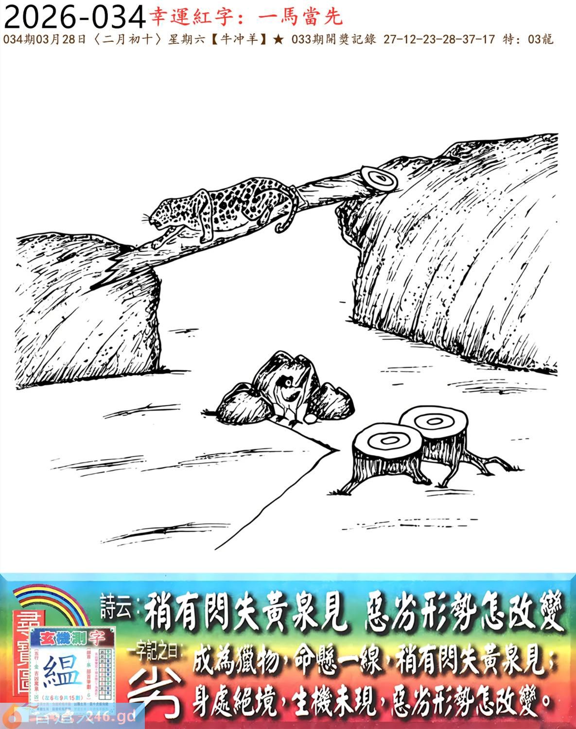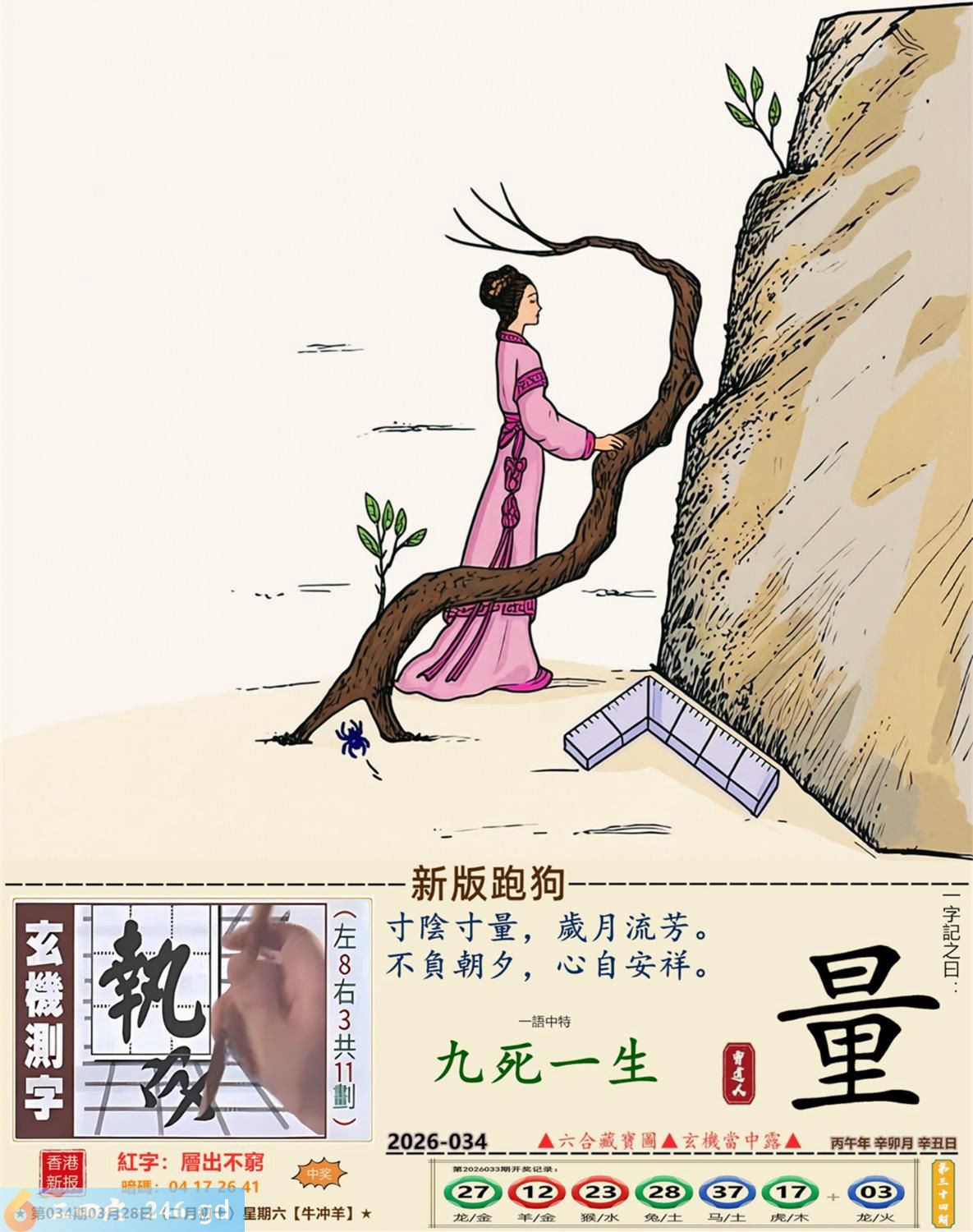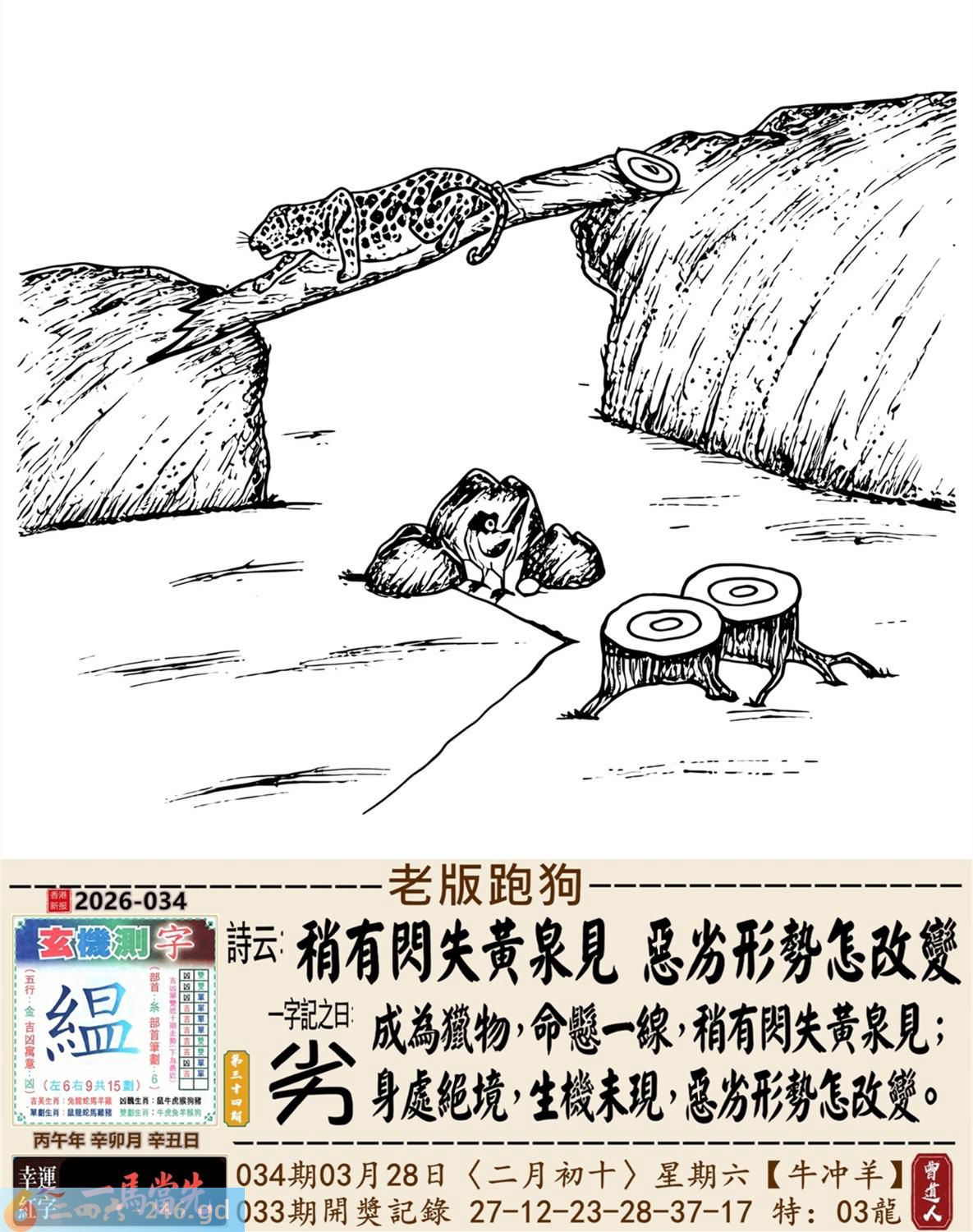 2026年3月28日星期六壁上土牛日冲羊 034期:老版跑狗玄機一字記之曰:【劣】 詩云:稍有閃失黃泉見,惡劣形勢怎改變。 成為獵物,命懸一線,稍有閃失黃泉見; 身處絕境,生機未現,惡劣形勢怎改變。 玄機測字:《緼》 密圖詩:一二好運伴八在 記:三人玩耍最開心 特碼大小單雙句:一山不能容二虎 今期必中:貂蟬 034期:特碼歇后語 敲碎的铜锣-----名(鸣)声不 034期正版四字梅花诗:破旧立新。 034期火车头:烧伤狗。诗:猴死龙伤,无穷二四过一边。 034期香港第一手欲钱料:石头? 034期曾道人说:“龙?” 034期另版四字梅花诗:疯癫和尚。 034期香港第一手欲钱料:欲钱世界选美大赛的结果。 034期曾道人说:“为什么母爱最伟大”? 034期:二字经:红绿。 034期:辣辣是特码 034期智力金壤:胡言乱语 紅字:【層出不窮】 暗码:【04172641】 發財玄機圖:探索周圍儲備充足圖中明鼠藍綠 034期:藏寳圖 新:瘦影自临春水照 老:诗卷长留天地间 禁:鸡禁:0尾玄机字《霜》 2026年034期【生活幽默】版 〖長大了要像爸爸一樣〗 一家人坐在沙發上看電視,突然兒子:"爸爸,我長大了要像你一樣!" 媽媽:"兒子,你想像爸爸什呀?"爸爸聽後得意地笑道:"怎樣,老婆,我還是很優秀的?"轉頭問兒子:"兒子,説説像爸爸什麼?" 兒子:"像你一樣,每天可以和媽媽要十塊錢零花錢!" 爸爸:"......"